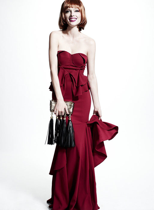 With colors ranging considerably, Posen knows how to make them all work like a piece of art. The grays gorgeously offset the green, deep red, black, navy and yellow. Pale pink and white look subtle yet powerful on the dresses, pants and jackets. The designer is an aficionado of occasion dresses, and made sure to include several. The standout piece is the simple green strapless gown that would look killer with any of the shorter jackets… still, one of our favorites is a metallic green moto jacket.