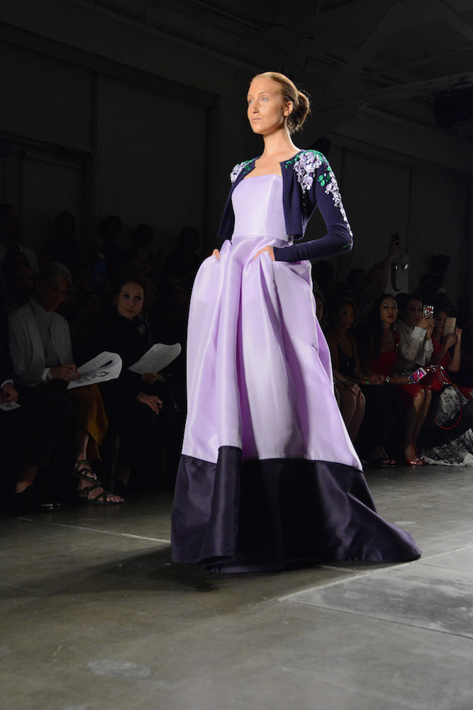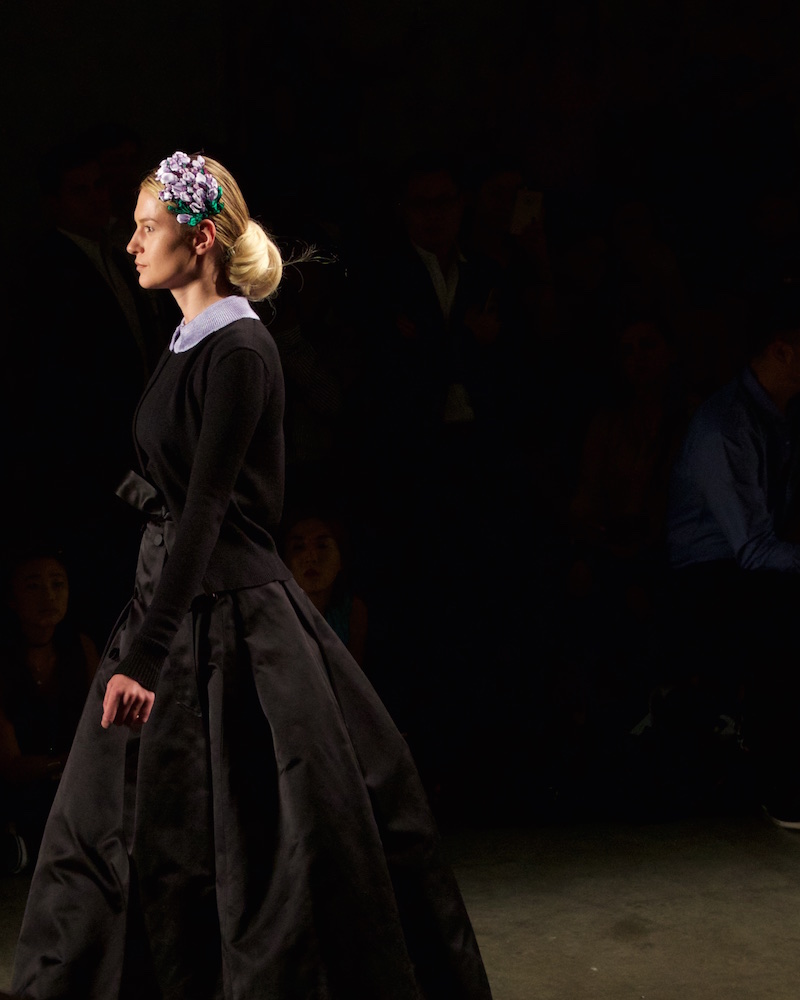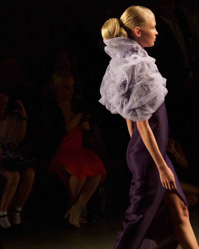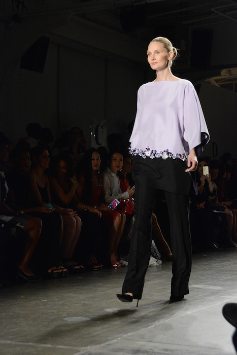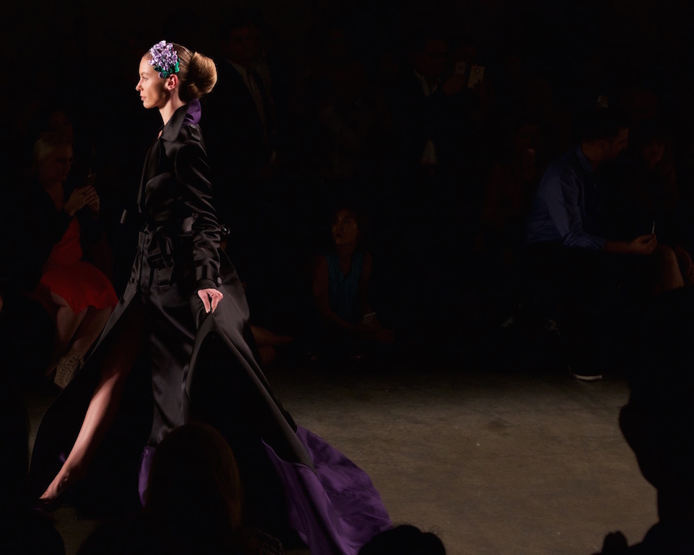 As the first three looks made their way down the runway, the practical beiges and blacks took on a Parisian twist with hints of floral, lilac details and celadon green appliqués. Gradually, the staple black faded into a deep a purple, and Toi’s second, more formal look, introduced itself to the crowd. [click any photo below to launch photo gallery].