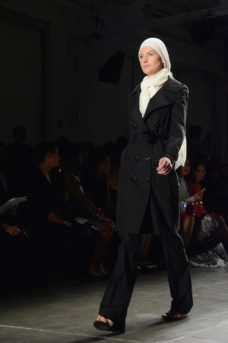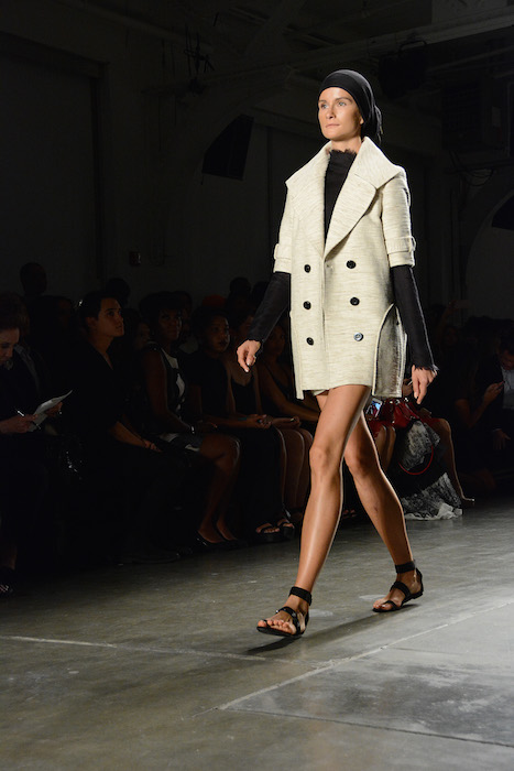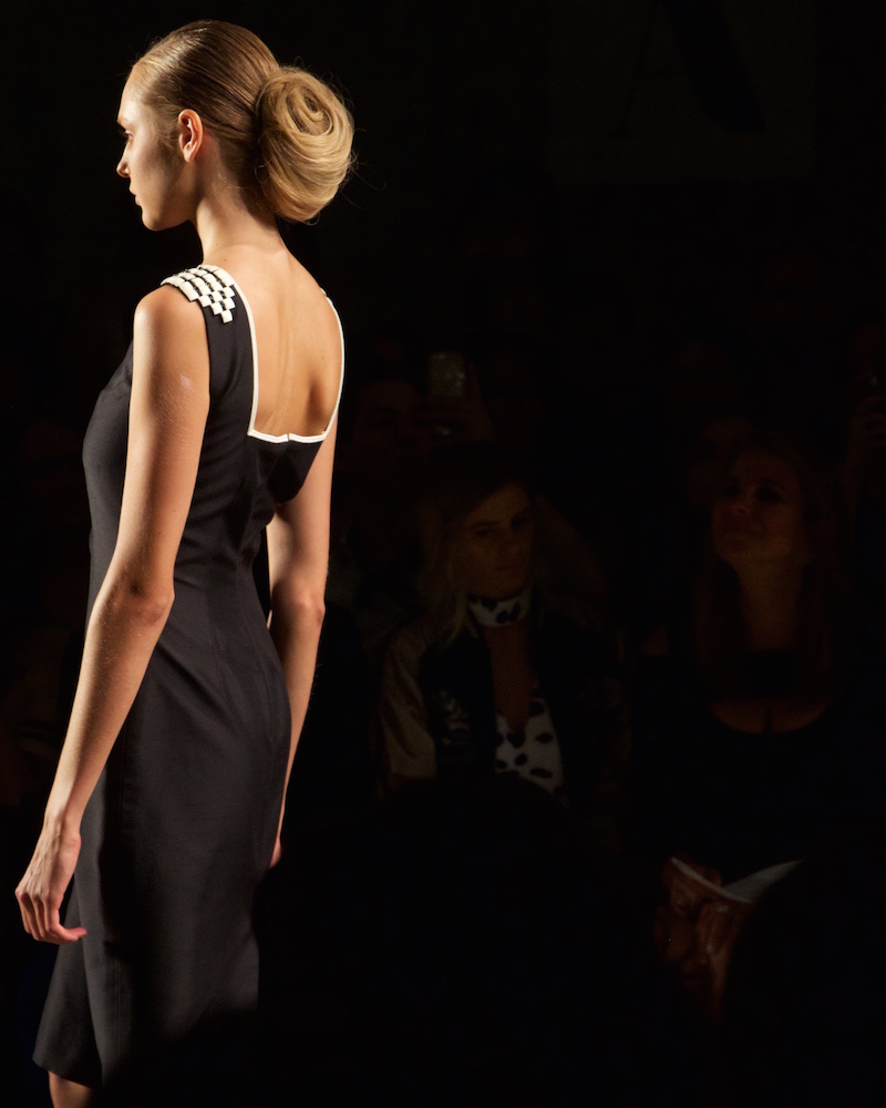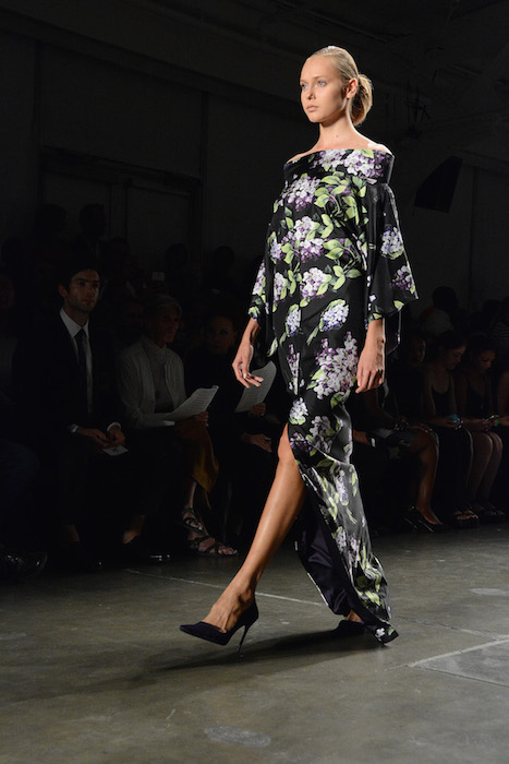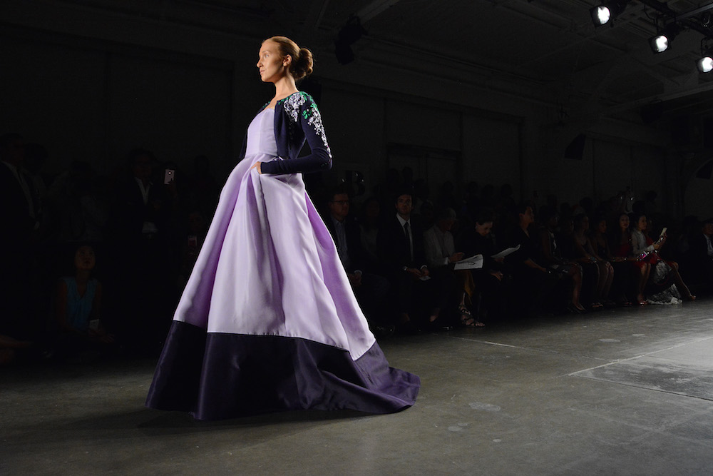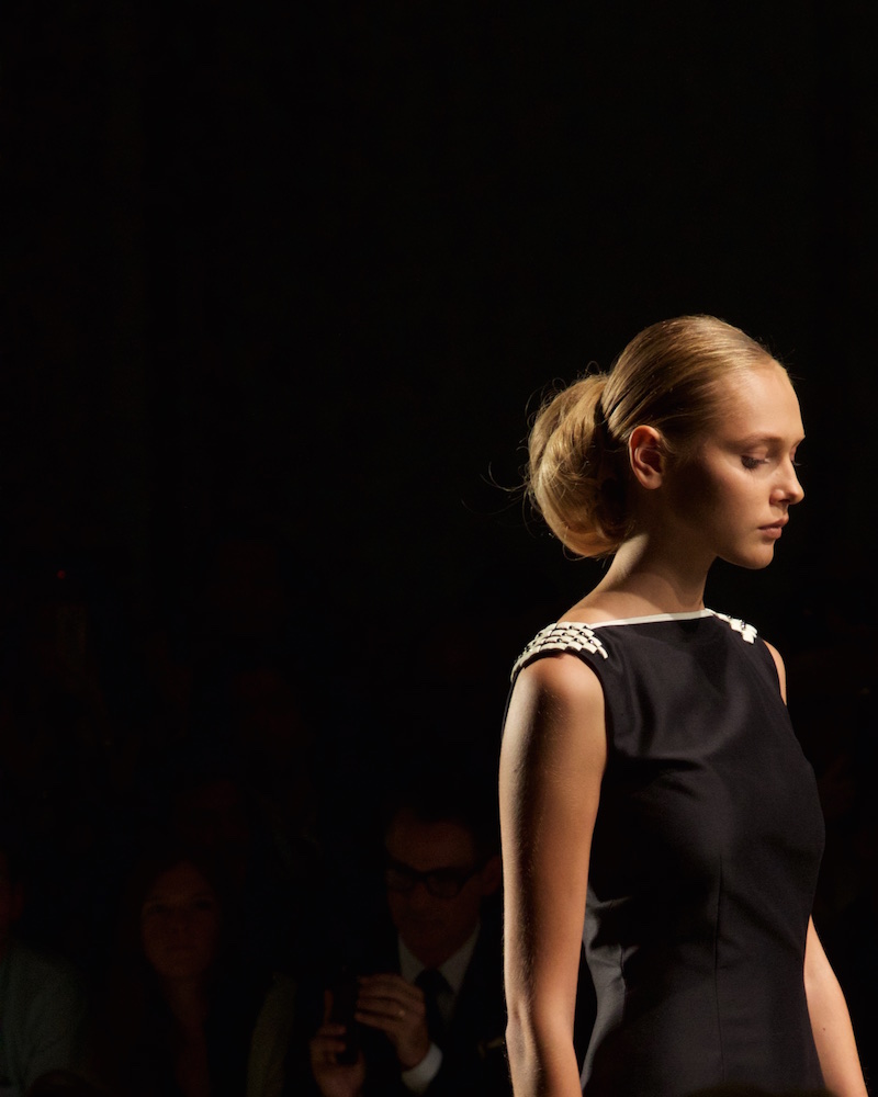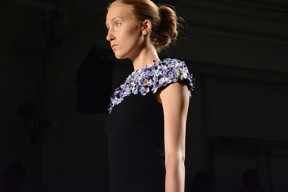 As the first three looks made their way down the runway, the practical beiges and blacks took on a Parisian twist with hints of floral, lilac details and celadon green appliqués. Gradually, the staple black faded into a deep a purple, and Toi’s second, more formal look, introduced itself to the crowd. [click any photo below to launch photo gallery].