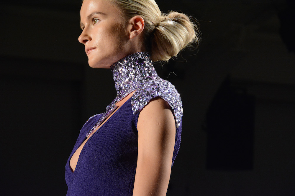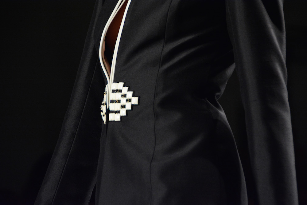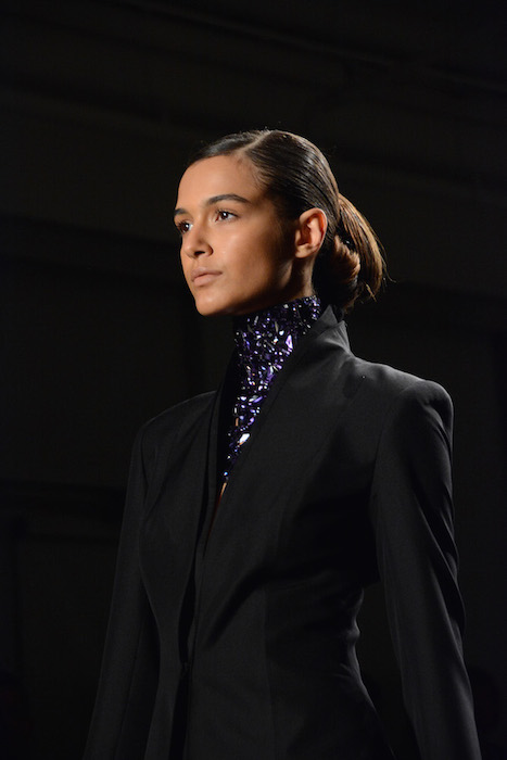 Putting a glamorous twist on the “choker” trend that has made it’s way back into fashion; Toi stunned the audience with two beautifully jeweled chokers. The carefully handcrafted chokers added volume and sparkle to a simple black blazer and a gorgeously deep purple gown. The audience was enthralled. As the music swelled to a close, Zang made his way down the runway with his final look bringing the audience out of a dream-like Parisian state of mind.