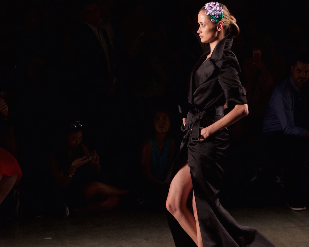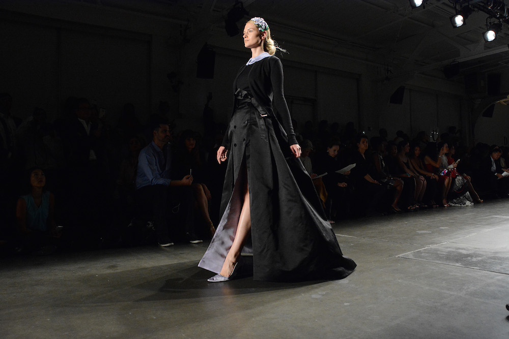 As French music swelled through the classic monochrome room, guests found their seats and settled in with the anticipation of Zang Toi’s Spring 2017 collection. Models appeared on the runway in beige coats and cardigans accompanied by black trench coats. These looks were a noticeable contrast to Toi’s previous collections that had typically consisted of brightly colored capes and trench coats. However, Toi remained true to his tradition of having three separate parts of the show that encompassed everything from relaxed daily wear to striking evening gowns.