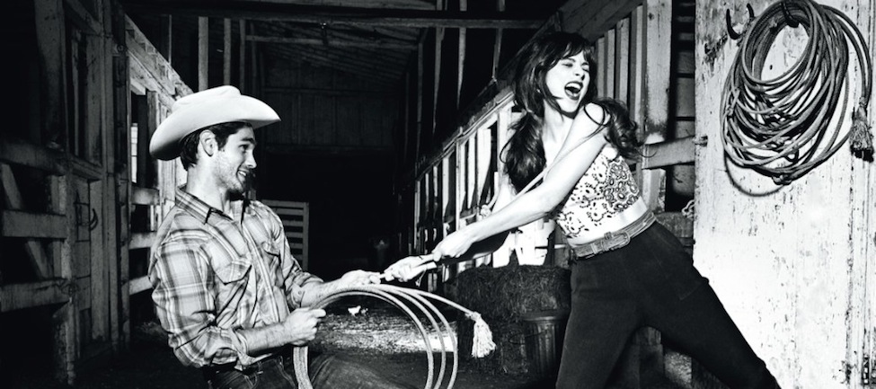 · Photo 2- (Black and white) Zooey with model Justin Gaston wearing What Comes Around Goes Around boots and vintage belt.
